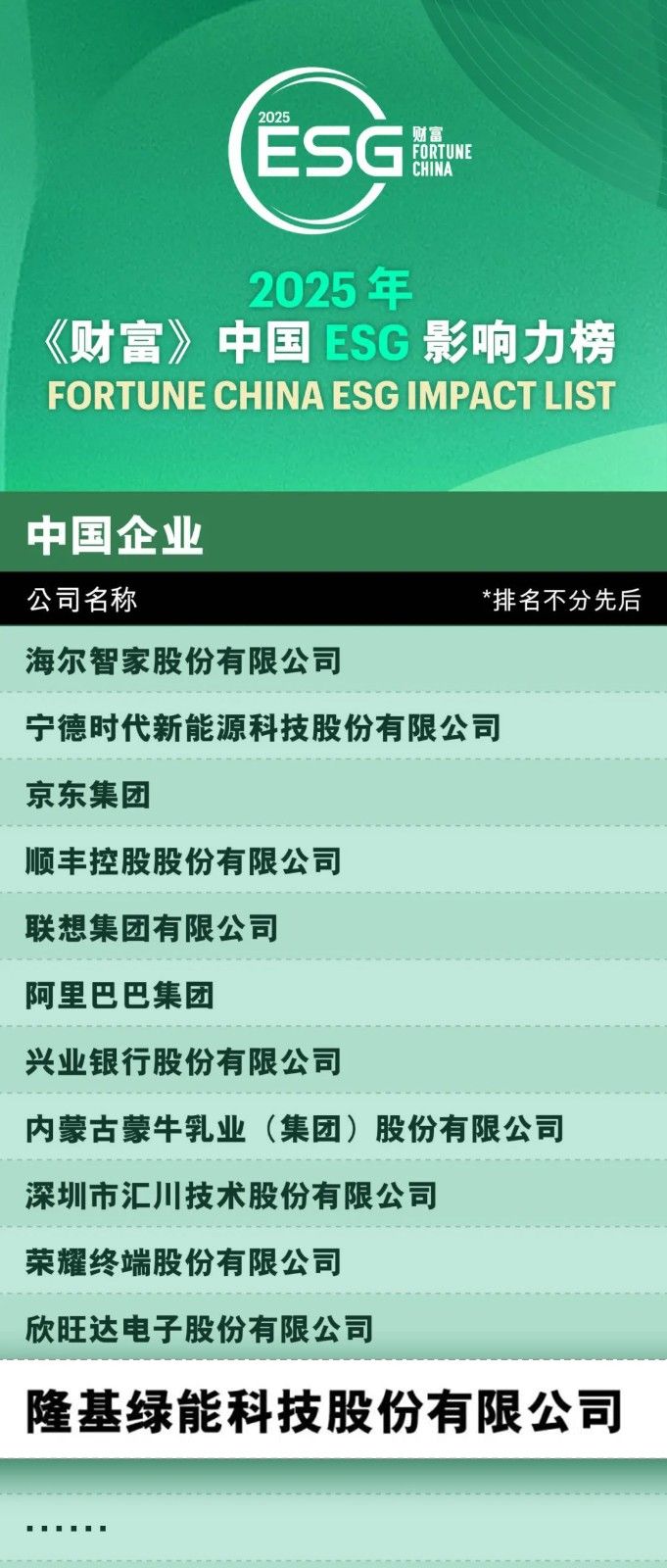 5月16日,《财富》中国ESG影响力榜正式揭晓,隆基凭借其在环境、社会与公司治理(ESG)领域的卓越实践再度上榜。这是隆基自该榜单创立以来第三次获此殊荣,进一步彰显了隆基在全球光伏行业可持续发展实践的影响力。