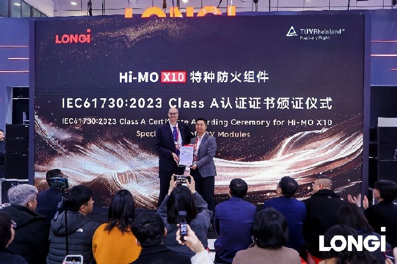 随后,德国莱茵TÜV为Hi-MO X10颁发国内首个完整组件Class A级防火认证。这份认证的特殊之处在于:它不是仅对单块送样组件负责的“检测报告”,而是对每一块量产组件负责的“认证证书”。