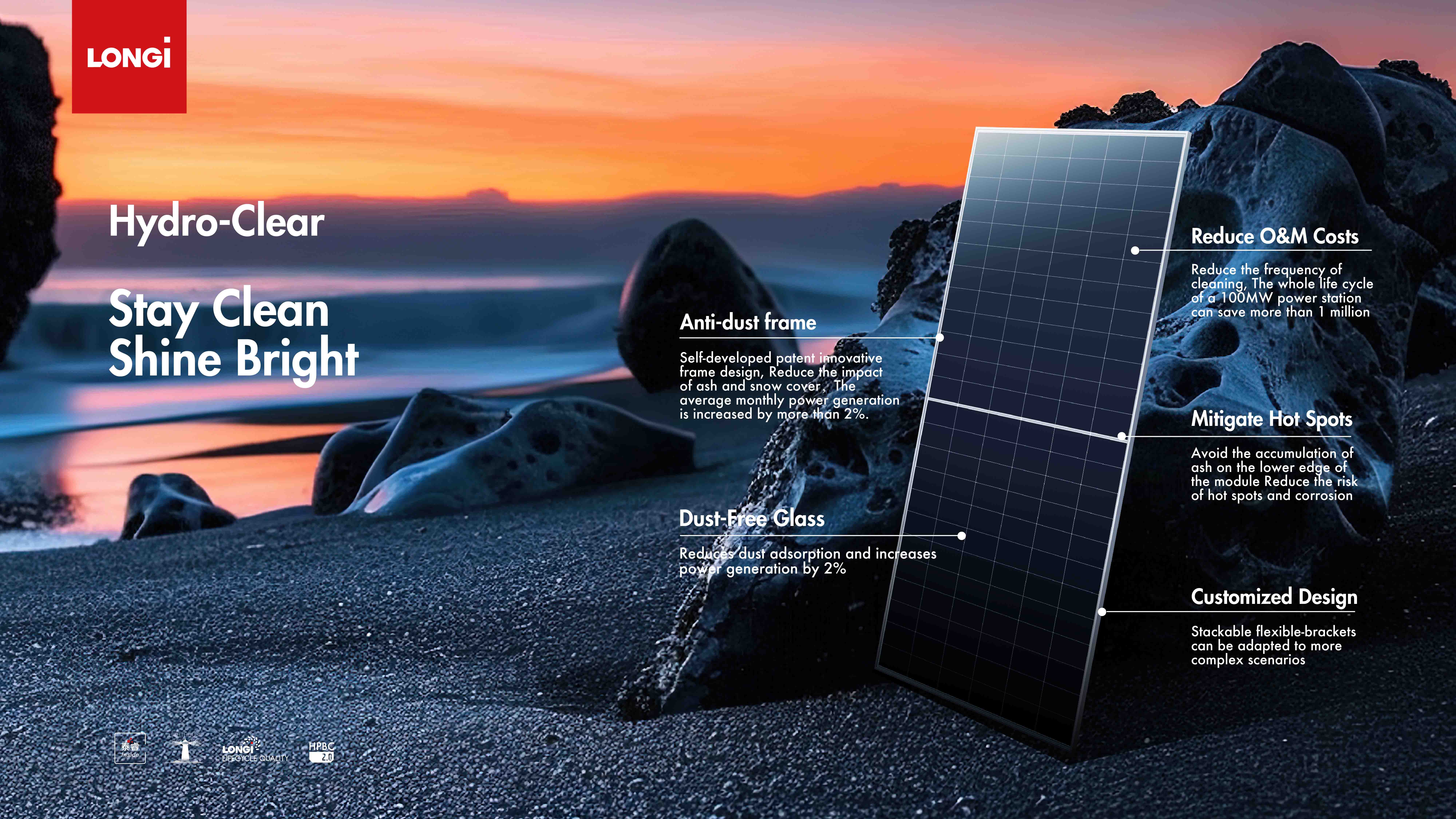 As one of the flagship scenario-based products in LONGi’s utility-scale lineup, the Hi-MO 9 HydroClear Module features a unique design with a short frame, no A-surface protrusion, and a completely flush glass surface. This fundamentally enhances the module’s ability to prevent dust and snow accumulation, ensuring every ray of sunlight is captured efficiently. From extreme laboratory tests to real-world extreme climate challenges, the HydroClear Module truly delivers on the customer value of higher energy yield, superior reliability, and lower O&M over the entire lifecycle, unlocking boundless possibilities for global carbon reduction and a green, sustainable transition.